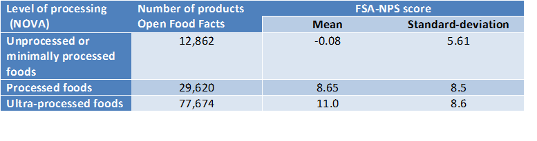 Table 1 shows that in the Open Food Facts database, the FSA-NPS score underlying the Nutri-Score (lower scores corresponding to higher nutritional quality and conversely) is on average lower for unprocessed or minimally processed foods (NOVA1), while ultra-processed foods (NOVA4) have the lowest average nutritional quality (corresponding to foods with less favourable rating in the Nutri-Score scale)). Processed foods (NOVA3) are in an intermediate position in terms of nutritional quality.