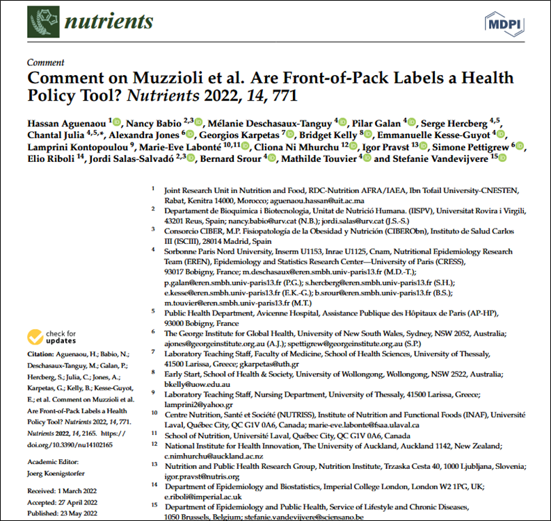 Our answer : « Unequivocally yes – and science points to the most effective schemes » published by Aguenaou H, Babio N, Deschasaux M, Galan P, Hercberg S, Julia C, Jones A, Karpetas G, Kelly B, Kesse-Guyot E, Kontopoulou L, Labonté ME, Ni Mhurchu C, Pravst I, Pettigrew S, Riboli E, Salas J, Srour M, Touvier M, and Vandevijvere S, in Nutrients, 2022