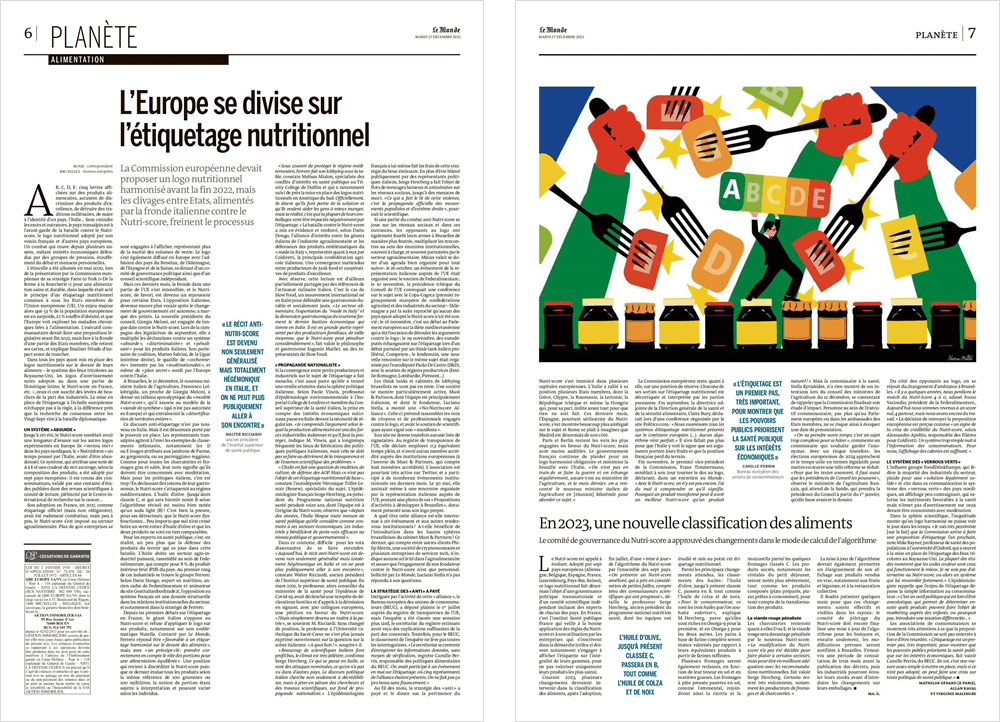 Le 26 décembre 2022, trois journalistes du Monde, Mathilde Gérard, Allan Kaval (correspondant à Rome) et Virginie Malingre (du bureau européen à Bruxelles) ont publié une enquête très documentée sur la bataille européenne du Nutri-Score, les stratégies des lobbys et les pressions politiques du gouvernement italien.
