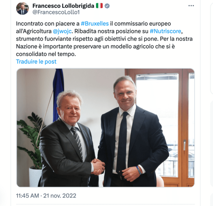 Un tweet du ministre Francesco Lollobrigida, qui se félicite de sa rencontre avec Janusz Wojciechowski : « Nous avons réaffirmé notre position sur le Nutri-Score, un outil trompeur. » © DR