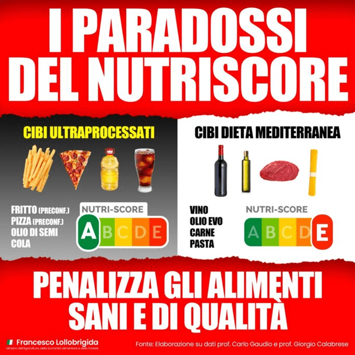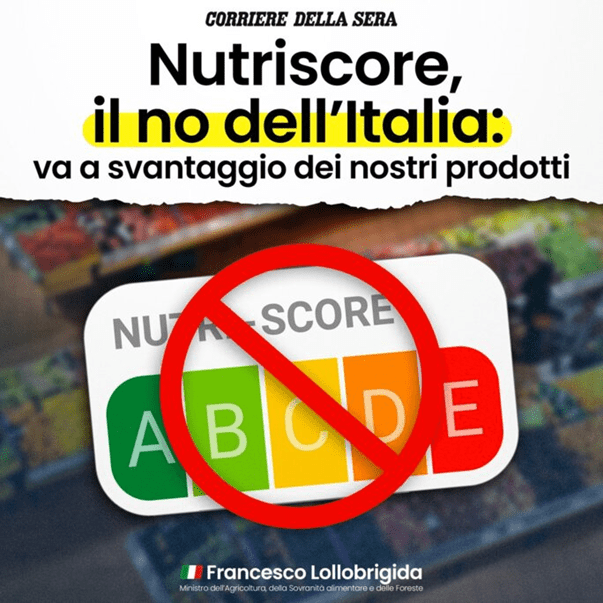 Nommé ministre de l’agriculture un mois plus tôt, le beau-frère de Meloni participe le même jour à sa première réunion avec ses homologues des 27 États membres de l’UE à Bruxelles. Lors d’un point presse, il tacle aussitôt le logo nutritionnel. L’Italie n’a pas besoin d’instruments « qui ne donnent pas suffisamment d’informations » et « qui sont même dangereux du point de vue du conditionnement du consommateur », prétend-il.