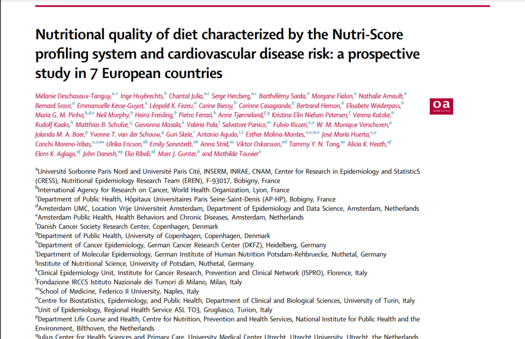 Un artículo publicado el 11 de septiembre de 2024 en el Lancet Regional Health – Europe informa de un mayor riesgo de enfermedades cardiovasculares asociado con el consumo de alimentos menos bien clasificados en la escala Nutri-Score (nueva versión) en la cohorte europea EPIC (European Prospective Investigation into Cancer and Nutrition).