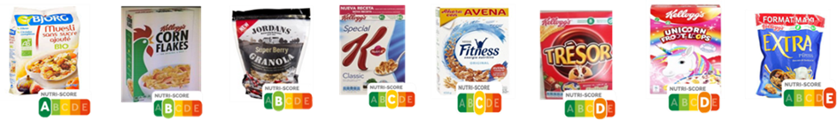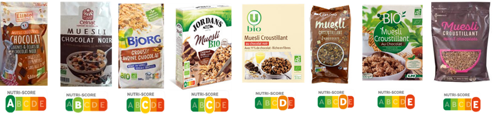 For example, within the breakfast cereals category, one can compare mueslis or granolas versus chocolate cereals, versus chocolate-filled cereals… (with Nutri-Scores ranging from A to E).