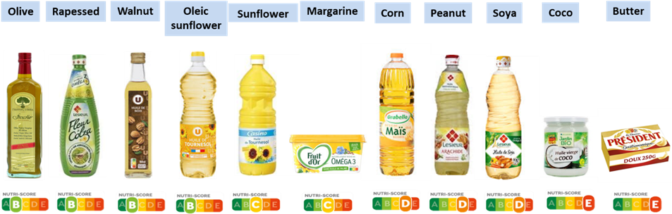 2. All the added fats were classified in the same Nutri-Score category, but it was clear that it is relevant to discriminate between animal fats richer in saturated fatty acids (such as butter) and vegetable fats less rich in saturated fats (oil, margarines), consistent with food-based dietary guidelines for the general population. The modification made to the algorithm permits to discriminate between the two groups since animal fats are all in E (with palm and coco oil), unlike vegetable oils and vegetable margarines which are better classified (in D or C).