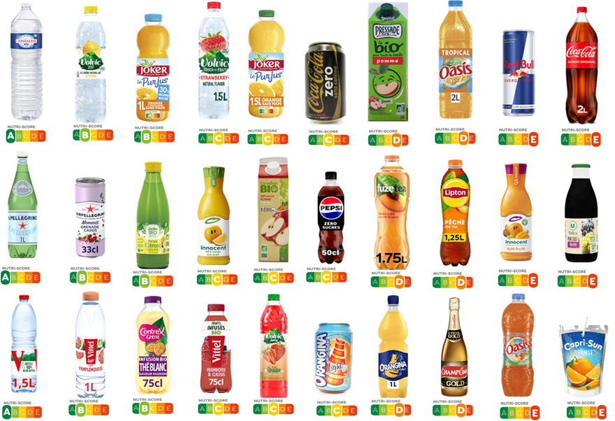 Another example: within the beverage category (plain or flavored water, fruit juices, fruit-based beverages, sodas, dairy-based drinks, plant-based drinks, etc.), being able to easily assess the differences in nutritional quality (with Nutri-Scores ranging from A to E based on sugar content and/or the presence of sweeteners).
