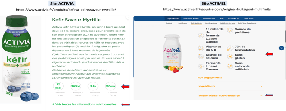 The Actimel, Activia, and Danonino websites do not prominently display the sugar content of the different products in their general, easily accessible pages, while their protein and calcium contents, as well as their sources of calcium, vitamins B6 and D, and protein, are specifically highlighted in large print, along with the fact that they do not contain gluten or food dyes, and that they provide active ferments… You must click on “See all nutritional information” to find in the displayed nutritional table the carbohydrate content, including the total amount of sugars among many other data.